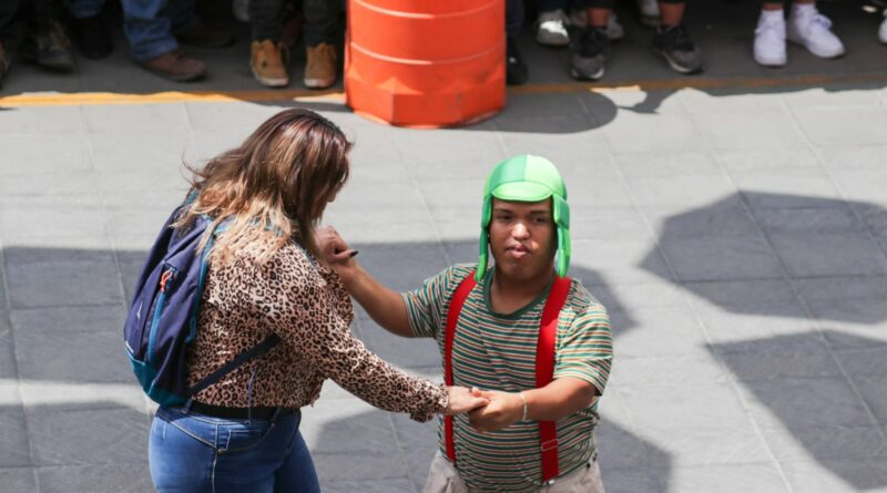 Locatarios del centro histórico de Metepec, llevaron al famoso animador “Medio Metro” para deleitar al púbico reunido en la calle Miguel Hidalgo, justo donde se ubican las sombrillas.
