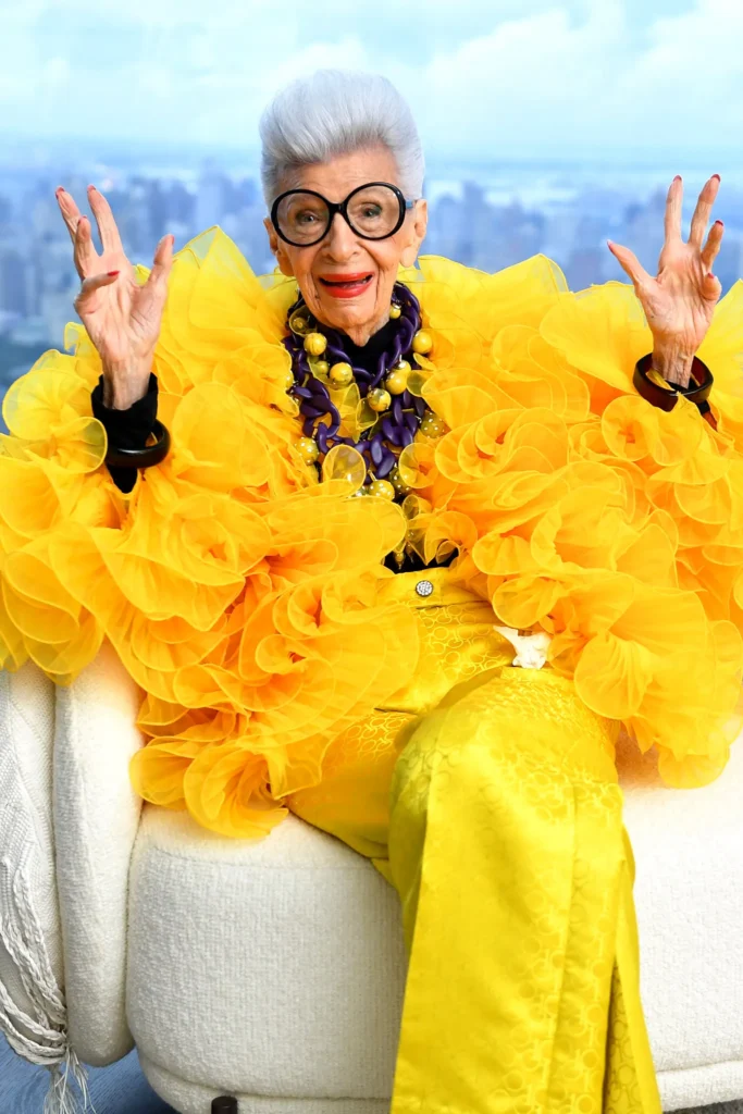 Con atuendos estrafalarios, sombra de ojos azul hielo y labios rojo rubí, el rostro cada vez más familiar de Apfel aparecía en primera fila en los desfiles y brillaba en los quioscos con trajes verde pimiento, abrigos frambuesa, boas de plumas turquesa y su fiel bastón. “Soy una adicta total al trabajo, pero ni en mis sueños más salvajes pensé que sería una chica de portada a mis noventa años”, declaró a The Times of London.