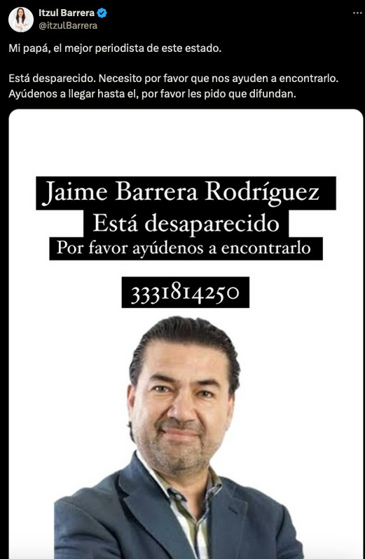 Finalmente, la propia hija del periodista, Itzul Barrera además comparte el número 3331814250 para quienes puedan dar información sobre la localización de su padre.