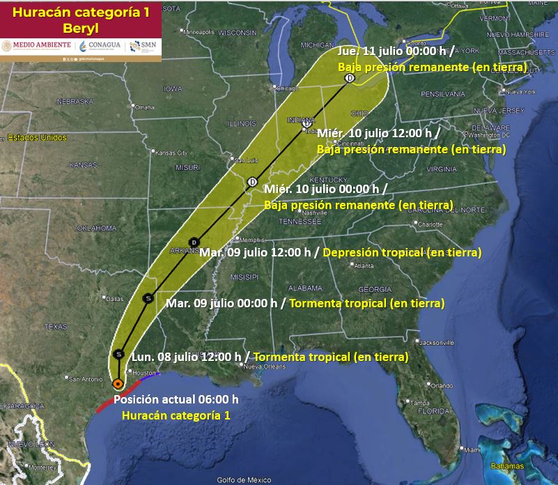 Durante este fin de semana, la tormenta tropical Beryl se intensificará a huracán de categoría 1 sobre el norte del Golfo de México, continuará acercándose a la costa norte de Tamaulipas, previéndose que, durante la madrugada del lunes, Beryl impacte entre la costa norte de Tamaulipas y el sur de Texas, EUA.