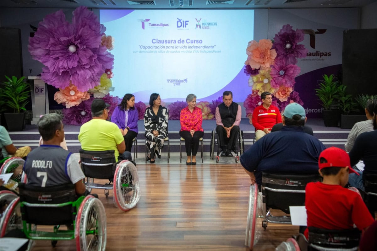 Ciudad Victoria, Tamaulipas.– Con la presentación de una novedosa silla de ruedas bipedestadora, el Sistema DIF Tamaulipas, que preside la doctora María de Villarreal, y la asociación Vida Independiente llevaron a cabo la clausura del Curso para la Vida Independiente, en el que participaron beneficiarios de sillas de ruedas y alumnos del Centro de Rehabilitación y Educación Especial (CREE).