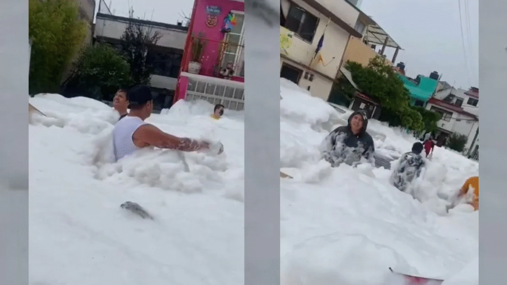 En redes sociales se publicó un video en el que vecinos de la colonia San Rafael armaron una “fiesta de espuma” y bromearon con que “el que caiga en las coladeras pierde”.